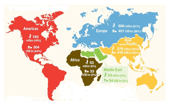 Slika 1 Prihodi in prihodki od turizma v letu 2015 na globalni ravni prikazuje, da je bilo v letu 2015 1.186 milijona mednarodnih turisti?nih prihodov (angl. international tourist arrivals – ITA) in 1.260 milijard ameriških dolarjev mednarodnih turisti?nih prihodkov (angl. international tourism receipts – ITR). Evropa je vodilna glede ITA (51 odstotkov) in ITR (36 odstotkov). Turizem na globalni ravni predstavlja 10 odstotkov bruto doma?ega produkta (BDP) in zaposluje vsakega 11 ?loveka na zemlji. Tabela 1 Prihodi in prihodki od turizma v letih 20100 - 2015 nazorno prikazuje konstantno naraš?anje števila prihodov in prihodkov od turizma. V letu 2015 je bilo 26,2 odstotkov ve? ITA kot leta 2010 v povpre?ju se ITA od leta 2010 do 2015 letno zvišuje za 4,8 odstotkov. Tudi ITR je v istem obdobju zrastel za 37,1 odstotka. Letno je ITR v povpre?ju naraš?al za 6,8 odstotkov.